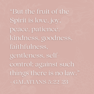 “But the fruit of the Spirit is love, joy, peace, patience, kindness, goodness, faithfulness, gentleness, self-control; against such things there is no law.”