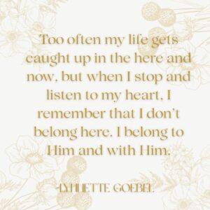 Too often my life gets caught up in the here and now, but when I stop and listen to my heart, I remember that I don’t belong here. I belong to Him and with Him.