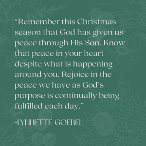 Remember this Christmas season that God has given us peace through His Son. Know that peace in your heart despite what is happening around you. Rejoice in the peace we have as God’s purpose is continually being fulfilled each day.