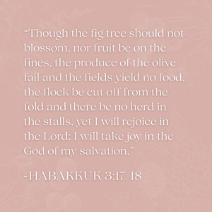 “Though the fig tree should not blossom, nor fruit be on the fines, the produce of the olive fail and the fields yield no food, the flock be cut off from the fold and there be no herd in the stalls, yet I will rejoice in the Lord; I will take joy in the God of my salvation.” Habakkuk 3:17,18